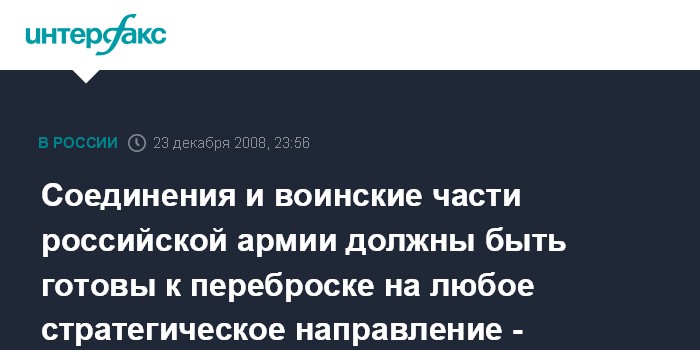 Москва. 23 декабря. ИНТЕРФАКС - Соединения и воинские части российской армии должны быть готовы к переброске в кратчайшие сроки на любое стратегическое направление, заявил во вторник глава Минобороны РФ Анатолий Сердюков.