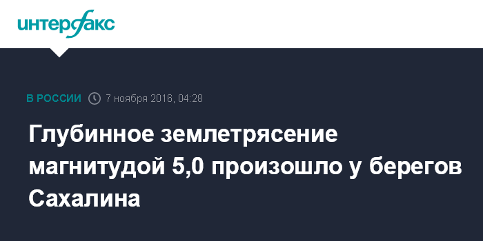 Москва. 7 ноября. INTERFAX.RU - Сейсмологи зарегистрировали землетрясение магнитудой 5,0, произошедшее в Охотском море у берегов Сахалина, сообщает в понедельник ДВРЦ МЧС России.