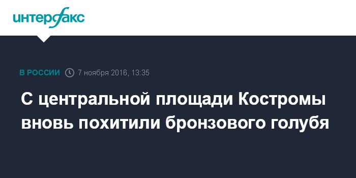 Москва. 7 ноября. INTERFAX.RU - Костромские полицейские вновь ищут похитителя бронзового голубя с Сусанинской площади в Костроме. Об этом в понедельник сообщили в пресс-службе областного управления МВД.