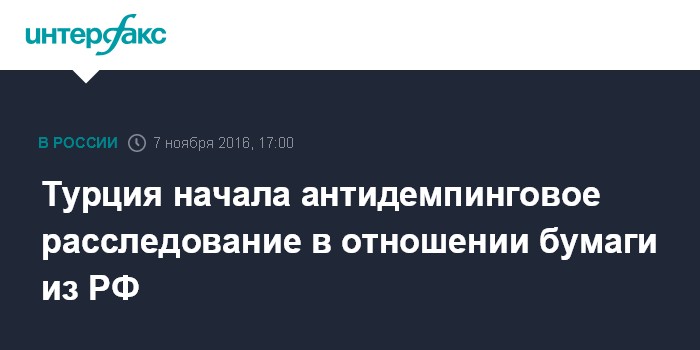 Москва. 7 ноября. INTERFAX.RU - Министерство экономики Турции начало антидемпинговое расследование в отношении бумаги, импортируемой из ряда стран, в том числе из России, говорится в Минэкономразвития РФ.