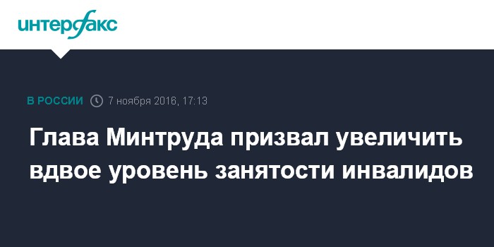 Москва. 7 ноября. INTERFAX.RU - Уровень занятости инвалидов во всех регионах России составляет в среднем 30%, эти показатели должны увеличиться вдвое, заявил в понедельник министр труда и социального развития Максим Топилин.