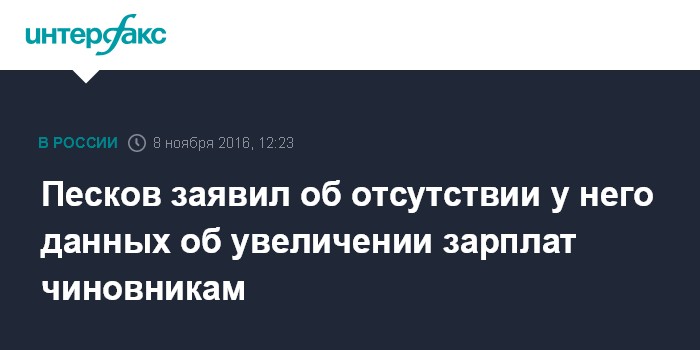 Москва. 8 ноября. INTERFAX.RU - Пресс-секретарь президента РФ Дмитрий Песков заявил, что ему не известно о возможных планах по увеличению зарплат российским чиновникам.