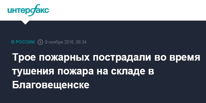 Москва. 9 ноября. INTERFAX.RU - Три человека получили травмы различной степени тяжести во время тушения пожара на складе с канцелярскими товарами и пиротехникой в Благовещенске Амурской области, сообщила агентству "Интерфакс" представитель регионального ГУ МЧС России Раиса Копырина.