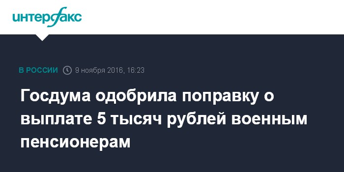 Москва. 9 ноября. INTERFAX.RU - Госдума одобрила поправку о распространении единовременной выплаты 5 тысяч рублей и на военных пенсионеров. Эту поправку в законопроект о единовременной выплате пенсионерам внесли на заседании Думы в среду депутаты от "Единой России".