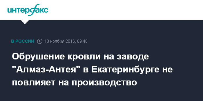Обрушение кровли на заводе "Алмаз-Антея" в Екатеринбурге не повлияет на производство