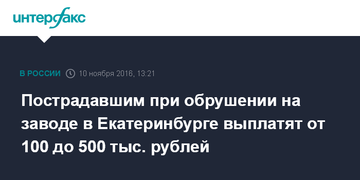 Пострадавшим при обрушении на заводе в Екатеринбурге выплатят от 100 до 500 тыс. рублей