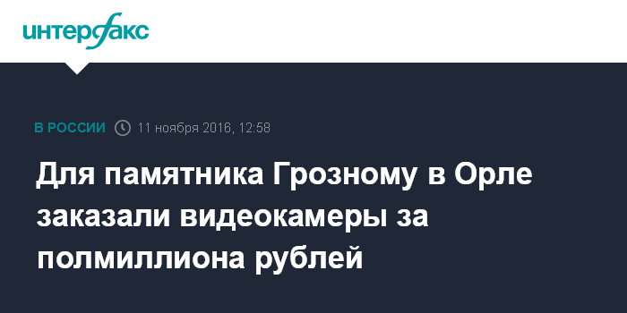 Москва. 11 ноября. INTERFAX.RU - За памятником Ивану Грозному в Орле будут следить с помощью камер видеонаблюдения. На сайте госзакупок в четверг размещен заказ на установку 8 видеокамер - 6 стационарных и 2 поворотных, который нужно выполнить до конца года.