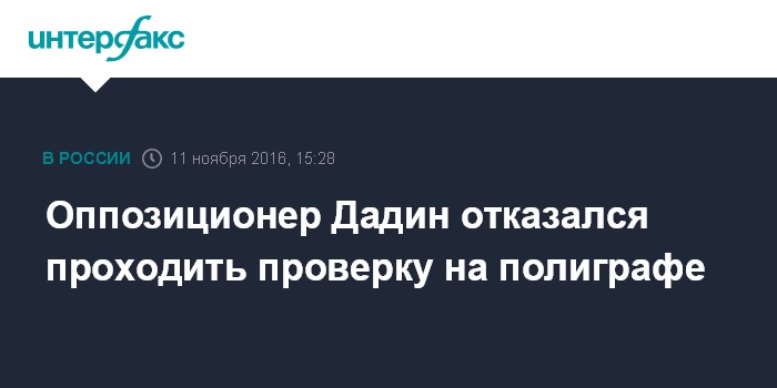 Москва. 11 ноября. INTERFAX.RU - Заявивший о пытках оппозиционер Ильдар Дадин в последний момент отказался проходить исследование на "детекторе лжи", который доставили в карельскую колонию, где он отбывает наказание, сообщил "Интерфаксу" в пятницу пресс-секретарь УФСИН по Карелии Виталий Фефелов.