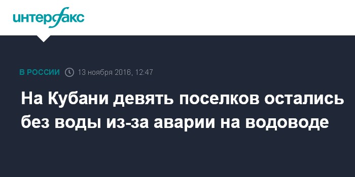 Москва. 13 ноября. INTERFAX.RU - Водоснабжение девяти населенных пунктов в Темрюкском районе Краснодарского края нарушено в воскресенье из-за аварии на магистральном водопроводе, сообщила пресс-служба ГУ МЧС по краю.