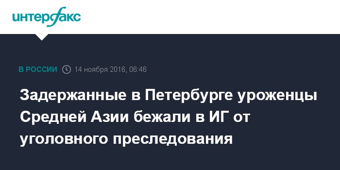 Москва. 14 ноября. INTERFAX.RU - Уроженцы Таджикистана, Узбекистана и Киргизии, задержанные сотрудниками ФСБ в Москве и Санкт-Петербурге в минувшие выходные за подготовку терактов, планировали ехать на "джихад" в Сирию, чтобы скрыться от уголовного преследования у себя на родине, пишет газета "Коммерсант" в понедельник.