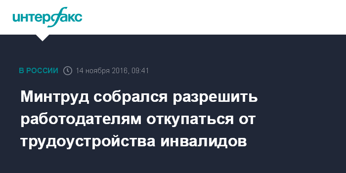 Москва. 14 ноября. INTERFAX.RU - Минтруд прорабатывает комплекс мер для увеличения уровня занятости инвалидов, при этом, работодателям могут разрешить вносить плату в случае отказа в трудоустройстве инвалидов. Об этом в интервью газете "Известия" рассказал замминистра труда и соцзащиты Григорий Лекарев.