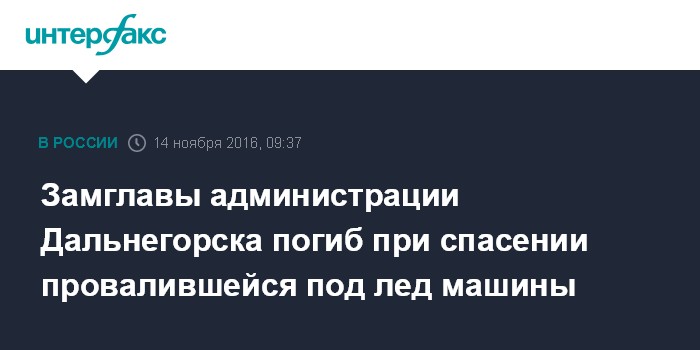 Москва. 14 ноября. INTERFAX.RU - Заместитель главы администрации города Дальнегорск Приморского края Владимир Кириченко погиб в понедельник, пытаясь спасти провалившуюся под лед машину.