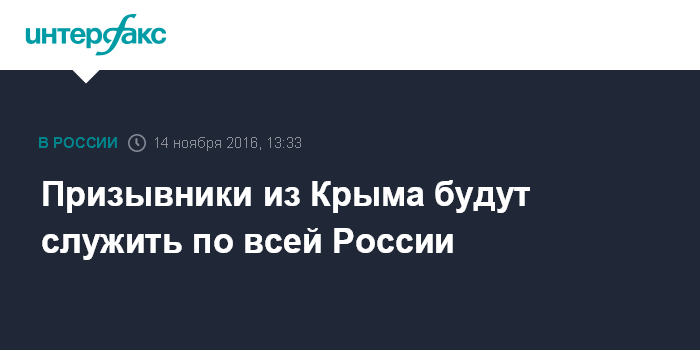 Москва. 14 ноября. INTERFAX.RU - С 2017 года призывники из Крыма начнут служить по всей России, сообщил журналистам начальник направления призыва и подготовки граждан к военной службе Главного организационно-мобилизационного управления Генштаба РФ полковник Алексей Князев в понедельник.