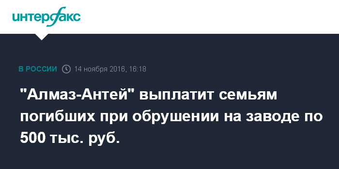 Москва. 14 ноября. INTERFAX.RU - ОАО "Концерн ВКО "Алмаз-Антей" принял решение о материальной компенсации семьям погибших работников и пострадавшим в результате обрушения кровли одного из цехов на машиностроительном заводе имени Калинина в Екатеринбурге (завод входит в концерн).