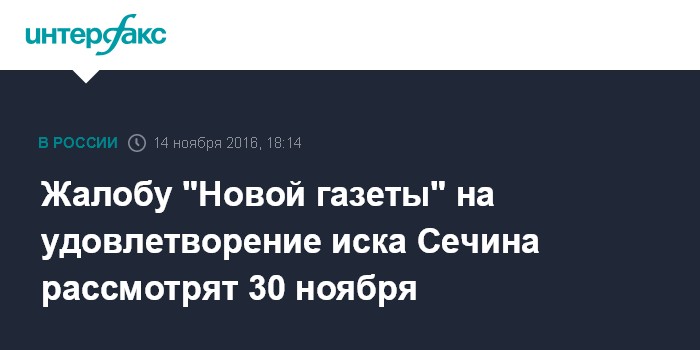 Жалобу "Новой газеты" на удовлетворение иска Сечина рассмотрят 30 ноября