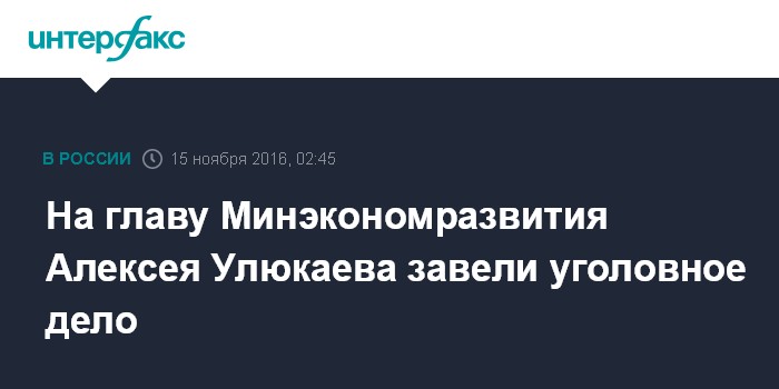 Москва. 15 ноября. INTERFAX.RU - На министра экономического развития РФ Алексея Улюкаева заведено уголовное дело, сообщается во вторник на сайте Следственного комитета.