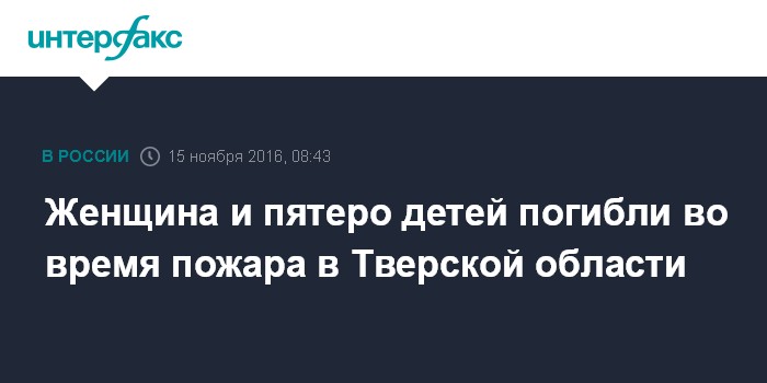 Москва. 15 ноября. INTERFAX.RU - Шесть человек, по предварительным данным, погибли во время пожара в ночь на вторник в деревне Пеньково Спировского района Тверской области, сообщили "Интерфаксу" в региональном ГУ МЧС. В следственном управлении СКР по Тверской области "Интерфаксу" сообщили, что в огне погибли 30-летняя женщина, а также пятеро ее детей (четыре мальчика и одна девочка).