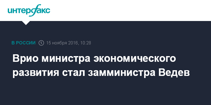 Этот приказ был подписан еще до задержания министра экономического развития РФ Алексея Улюкаева, отметил один из собеседников, нового приказа еще не было. До этого врио министра был Евгений Елин, но он уехал в командировку, и сейчас врио является Ведев.