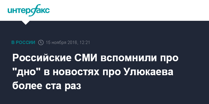 Москва. 15 ноября. INTERFAX.RU - Более ста публикаций российских СМИ, касающихся задержания министра экономического развития Алексея Улюкаева, так или иначе обыгрывают слово "дно", вспоминая его в заголовке или в тексте. Об этом свидетельствую результаты анализа, проведенного во вторник днем с помощью системы "СКАН-Интерфакс".