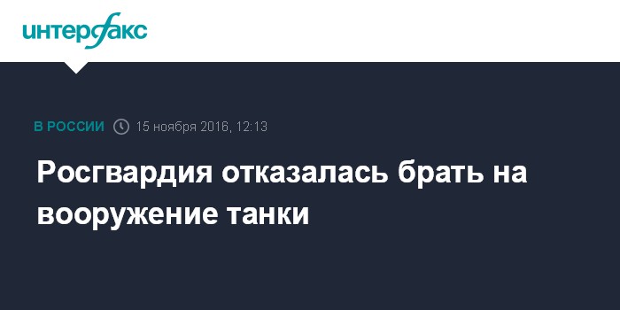 Москва. 15 ноября. INTERFAX.RU - Росгвардия не планирует закупать танки, сообщил журналистам заместитель главнокомандующего войсками Росгвардии Сергей Ерыгин.