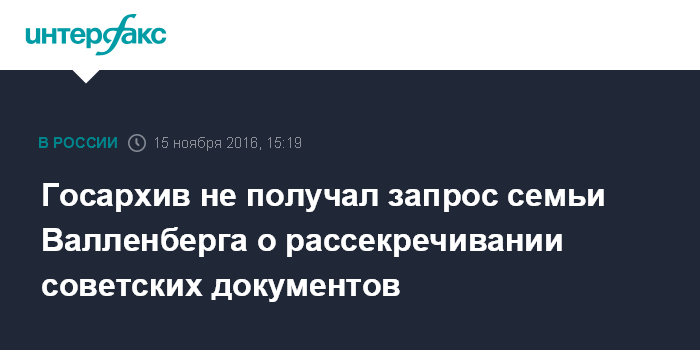 "Госархив запросов от семьи Валленберга (на получение оригиналов документов о допросах - ИФ) никогда не получал. Различного рода комиссии, которые представляли интересы семьи, были в Госархиве, делали запросы и получали необходимые документы. Оригиналы документов о допросах, если такие допросы были, находятся в ФСБ. Все вопросы в Центральный архив Федеральной службы безопасности", - сказал Мироненко во вторник "Интерфаксу".