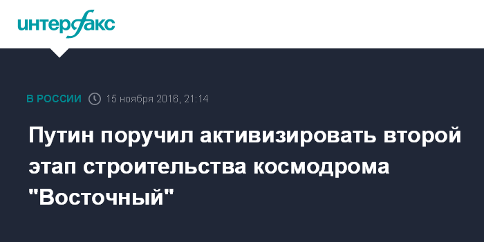 Москва. 15 ноября. INTERFAX.RU - Нужно активнее разворачивать второй этап строительства космодрома "Восточный", заявил президент РФ Владимир Путин.