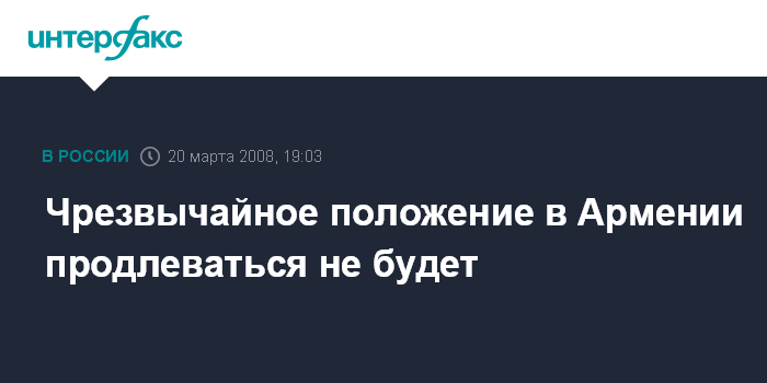 Ереван. 20 марта. INTERFAX.RU - Президент Армении Роберт Кочарян заявил, что не намерен продлевать сроки чрезвычайного положения, действующего в Ереване, сообщает "Интерфакс".