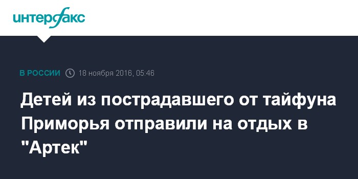 Москва. 18 ноября. INTERFAX.RU - Первая группа детей из районов Приморского края, пострадавших от тайфуна "Лайонрок", отправилась в международный детский центр "Артек" в Крыму, сообщила в пятницу пресс-служба администрации региона.