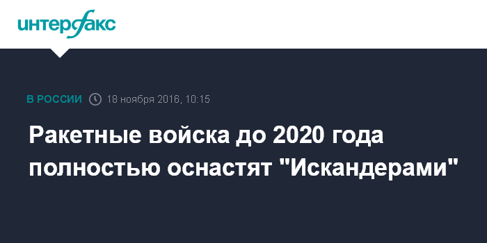 Москва. 18 ноября. INTERFAX.RU - Все ракетные соединения российской армии до 2020 года будут перевооружены тактическими ракетными комплексами (ОТРК) "Искандер-М", сообщил журналистам в пятницу начальник ракетных войск и артиллерии (РВиА) Вооруженных сил РФ Михаил Матвеевский.
