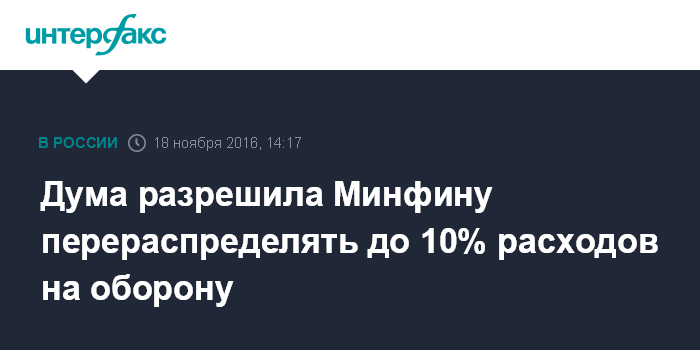 Москва. 18 ноября. INTERFAX.RU - Госдума на заседании в пятницу приняла в третьем итоговом чтении закон, который позволяет в ходе исполнения бюджета перераспределять расходы на оборону и национальную безопасность внутри установленных законом о бюджете лимитов, но не более чем на 10%.