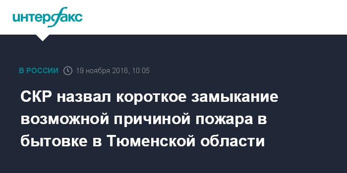 Москва. 19 ноября. INTERFAX.RU - Возгорание в вагончике-бытовке на стройплощадке в Тюменской области произошло, по предварительным данным, из-за замыкания проводки, сообщили "Интерфаксу" в пресс-службе следственного управления СК РФ по Тюменской области.
