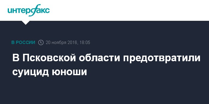 Москва. 20 ноября. INTERFAX.RU - В Псковской области в результате мониторинга социальных сетей выявили, задержали и поместили в психбольницу молодого человека, который собирался покончить с собой в собственный день рождения.