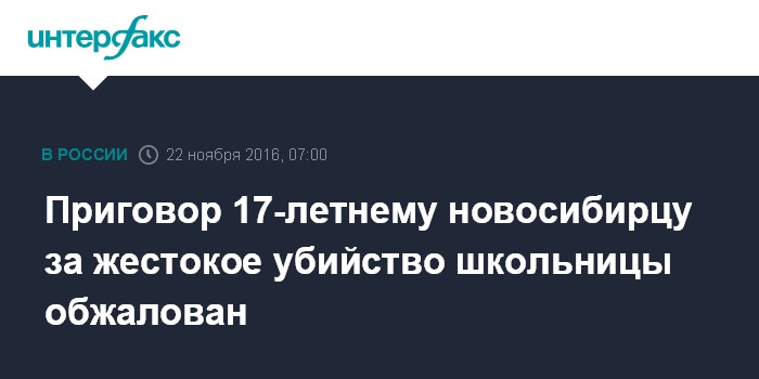 Как сообщалось, 31 октября Первомайский районный суд Новосибирска вынес приговор 17-летнему местному жителю, обвиняемому в жестоком убийстве своей сверстницы в августе 2015 года, назначив наказание в виде лишения свободы в воспитательной колонии на срок 9 лет. Суд признал подсудимого виновным в убийстве с особой жестокостью (п."д" ч.2 ст.105 УК РФ). Суд также назначил подсудимому принудительное лечение у психиатра по месту отбывания наказания.