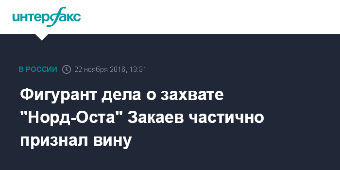 Москва. 22 ноября. INTERFAX.RU - Предполагаемый пособник террористов, захвативших заложников на Дубровке в 2002 году, Хасан Закаев частично признает свою вину в суде.
