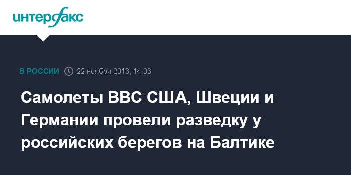 Москва. 22 ноября. INTERFAX.RU - Самолеты ВВС США, ВВС Швеции и ВМС Германии во вторник совершили одновременный подлет к морским границам Калининградской области для выполнения оперативных разведывательных заданий, свидетельствуют данные западных сайтов, отслеживающих передвижения военной авиации.