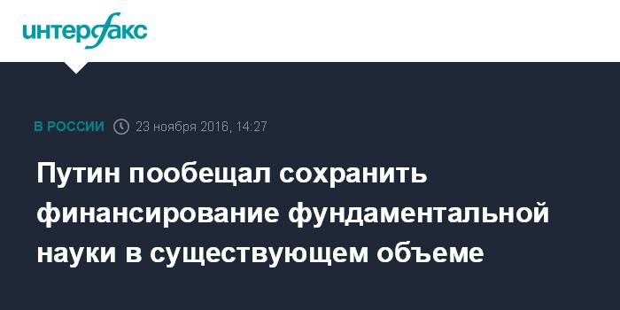 Москва. 23 ноября. INTERFAX.RU - Президент РФ Владимир Путин призвал уделить особое внимание развитию фундаментальных наук и сохранить их финансирование на нынешнем уровне.