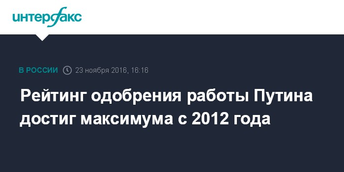Москва. 23 ноября. INTERFAX.RU - Доля россиян, одобряющих деятельность Владимира Путина на посту президента РФ, достигла максимума с 2012 года: тогда этот показатель был на уровне 63%, сейчас - 86%, сообщили "Интерфаксу" в "Левада-Центре". Недовольны работой Путина 14% россиян.