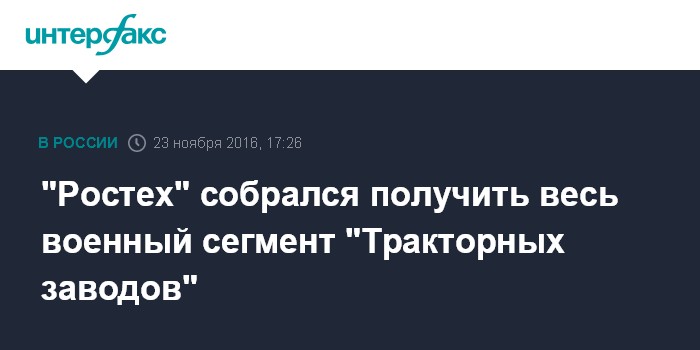 Москва. 23 ноября. INTERFAX.RU - Госкорпорация "Ростех" рассчитывает получить весь военный сегмент концерна "Тракторные заводы" (КТЗ), включая ОАО "НИИ Стали" - головное в России предприятие по материалам защиты вооружения и военной техники сухопутных войск.