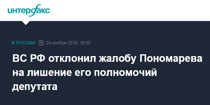 Москва. 24 ноября. INTERFAX.RU - Верховный суд РФ признал законным решение Госдумой предыдущего созыва о лишении депутатских полномочий Ильи Пономарева. Апелляционная жалоба адвокатов Пономарева на решение Думы отклонена.