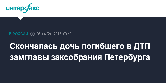 Скончалась дочь погибшего в ДТП замглавы заксобрания Петербурга