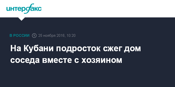 Москва. 25 ноября. INTERFAX.RU - Подросток в одном из сел Краснодарского края подозревается в убийстве соседа, чей дом он поджег, сообщила пресс-служба следственного управления СКР по краю в пятницу.