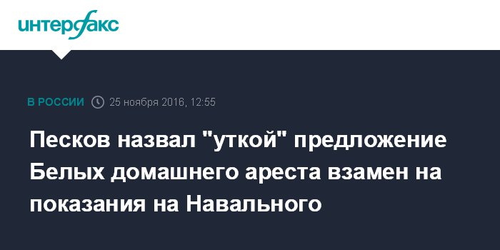 Москва. 25 ноября. INTERFAX.RU - Пресс-секретарь президента РФ Дмитрий Песков считает информационной "уткой" сообщения о том, что представители администрации президента якобы предлагали отпустить под домашний арест экс-губернатора Кировской области Никиту Белых в обмен на показания в отношении оппозиционера Алексея Навального по "делу Кировлеса".