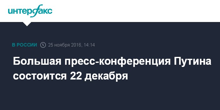 Москва. 25 ноября. INTERFAX.RU - Большая пресс-конференция президента России Владимира Путина назначена на 22 декабря.