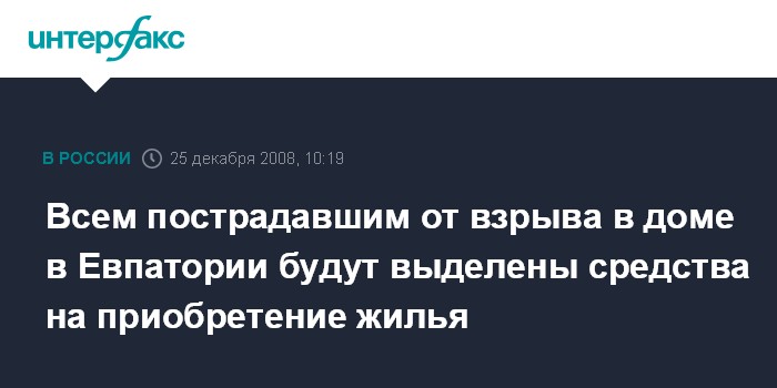 Москва. 25 декабря. INTERFAX.RU - Премьер-министр Украины Юлия Тимошенко заявляет, что всем пострадавшим от взрыва в доме в Евпатории будут выделены средства на приобретение жилья, а также компенсировано потерянное имущество. Об этом Тимошенко сказала журналистам в четверг в Киеве перед вылетом в Евпаторию.