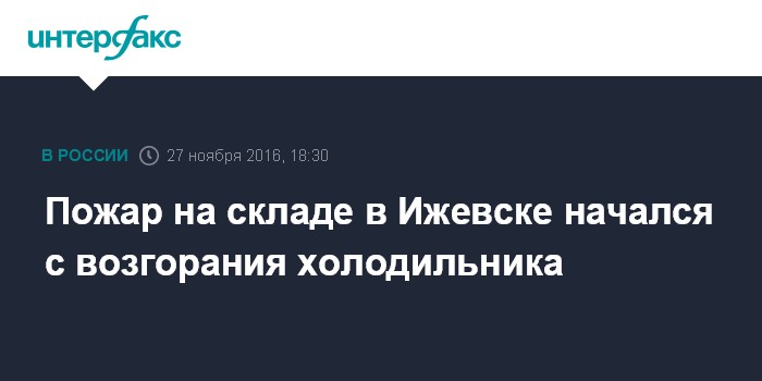 Москва. 27 ноября. INTERFAX.RU - Пожар на складе в воскресенье в Ижевске начался с возгорания холодильника, тушение продолжается, сообщает пресс-служба ГУ МЧС России по Удмуртии.