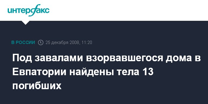 Москва. 25 декабря. INTERFAX.RU - По последним данным, под завалами взорвавшегося дома в Евпатории найдены 13 тел, сообщил агентству "Интерфакс-Украина" начальник пресс-службы министерства по чрезвычайным ситуациям Игорь Кроль. Как сообщалось, из-под завалов спасены 21 человек.