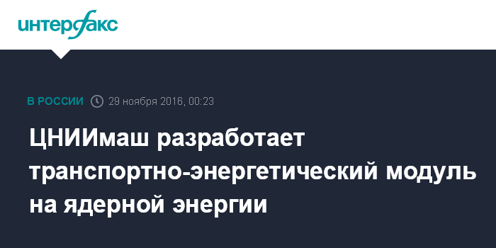 Москва. 28 ноября. INTERFAX.RU - Летный прототип транспортно-энергетического модуля (ТЭМ), работающего на ядерной энергии, появится в 2022-2023 годах, заявил генеральный директор ФГУП ЦНИИмаш Олег Горшков.