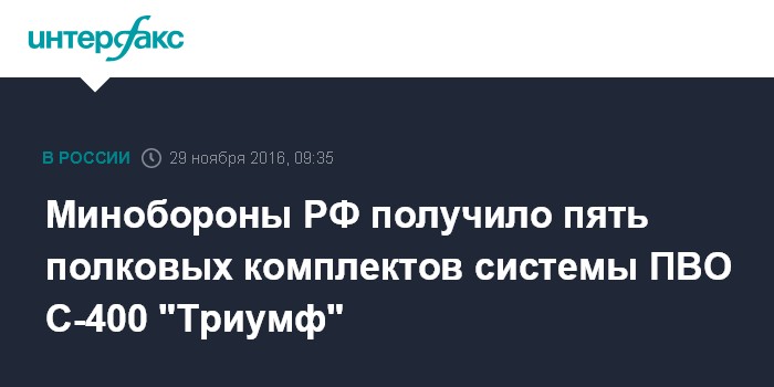 Москва. 29 ноября. INTERFAX.RU - Концерн ВКО "Алмаз - Антей" поставил российскому военному ведомству пять полков зенитной ракетной системы (ЗРС) С-400 "Триумф" в рамках гособоронзаказа на 2016 год, сообщает пресс-служба концерна.