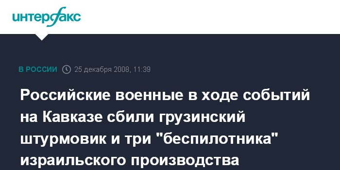 Москва. 25 декабря. INTERFAX.RU - Российские средства ПВО сбили в ходе вооруженного конфликта в Южной Осетии три беспилотных летательных аппарата (БЛА) израильского производства, сообщил начальник войсковой противовоздушной обороны Сухопутных войск генерал-майор Михаил Круш.