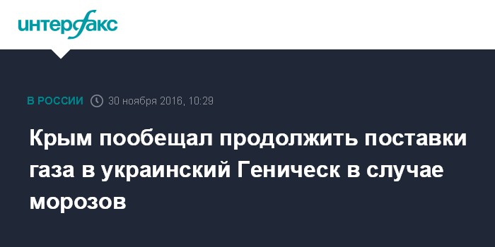 12 ноября президент РФ Владимир Путин поручил Аксенову обеспечить поставки газа в Геническ и Генический район в ответ на обращение местных жителей к властям Крыма. Вечером того же дня "Черноморнефтегаз" открыл кран. Крым подал в Геническ 3,5-4 тыс. кубометров газа, который пошел на выравнивание давления в системе. В целом регион готов направить в украинский город до 500 тыс. кубов газа.